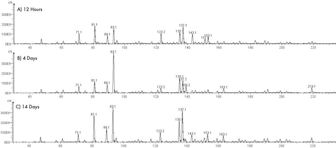 圖2:(A) 發(fā)酵開始的12小時(shí),(B) 4天,以及 (C) 14天獲取的質(zhì)譜圖