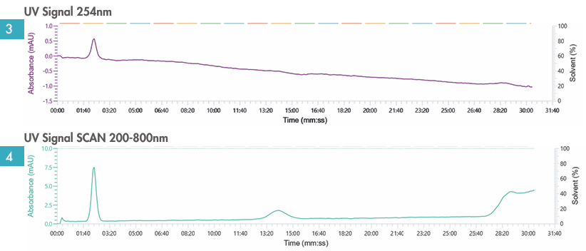 圖3與圖4:紫外檢測下化合物不可見。檢測初期首波化合物開始顯現(xiàn)低強度信號,但強度不足以實現(xiàn)有效收集